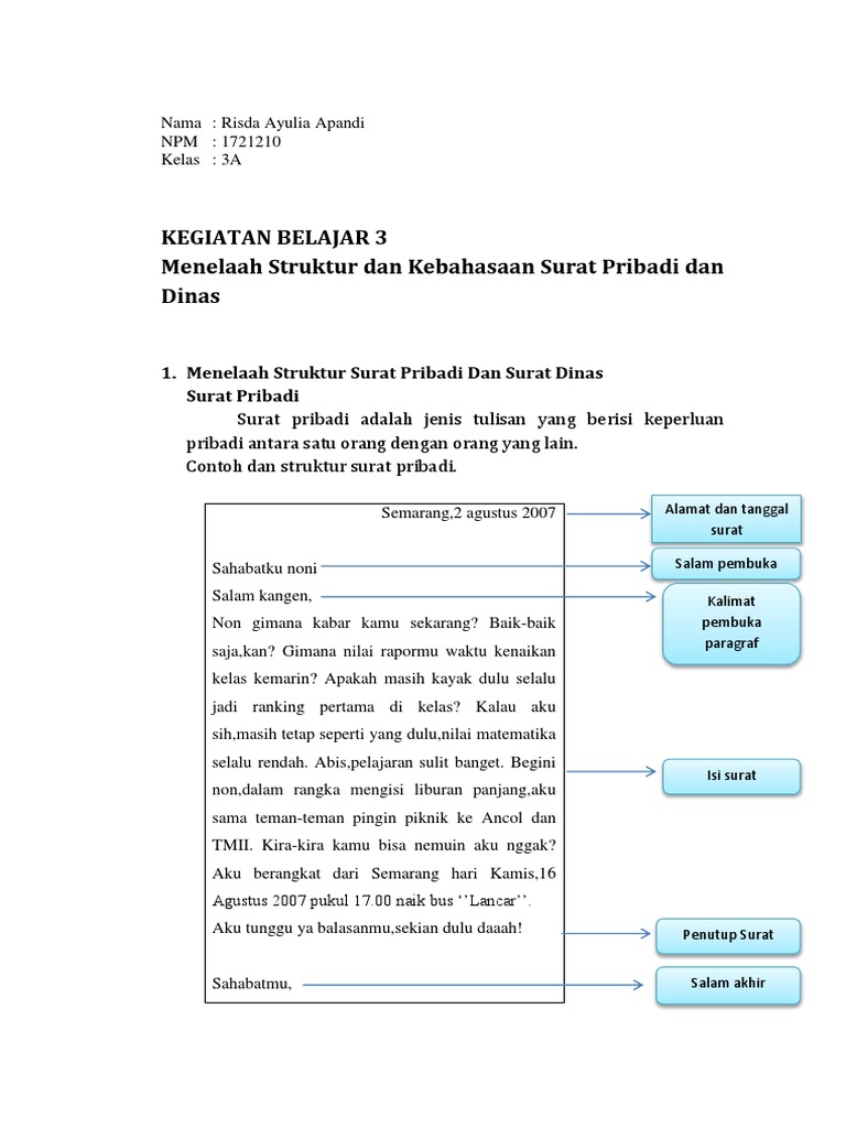 Smpn 3 Banda Aceh Gemilang Menelaah Struktur Surat Pribadi Dan Surat Dinas from 1.bp.blogspot.com 5 u n s r tanggal surat alamat surat salam pembuka pendahuluan isi surat penutup surat nama pengirim tanda tangan pengirim. Paragraf pembuka dalam surat pribadi bisanya berisi tentang luapan rasa rindu, menanyakan kabar dan lain sebagainya. Salah satunya adalah surat pribadi. Ini karena ketika menulis surat, penulis diwajibkan untuk membuat kalimat yang mudah dimengerti. Kalimat yang tepat untuk melengkapi bagian surat pribadi tersebut adalah … a. Kalimat yang digunakan dalam surat dinas hendaknya sesuai. Dengan hormat, salam sejahtera, saudara., saudara.yang terhormat, ibu. Surat pribadi & surat dinas.